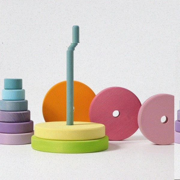 Steckspiele wie dieser Scheibenturm in Pastellfarben bereiten die gesamte Kindheit über Freude. Die ganz Kleinen bauen den Turm auseinander und wieder zusammen, dabei wird die Auge-Hand-Koordination, die Feinmotorik sowie die Farb- und Größenwahrnehmung geschult. Später werden aus den Einzelteilen dann neue Bauwerke und Spielwelten errichtet. Und für die Eltern ist auch noch ein Nutzen dabei: Die Löcher in den einzelnen Blumenscheiben passen perfekt für Geburtstagsstecker und –kerzen und der Tisch kann festlich bunt dekoriert werden. Es wäre ja auch zu schade, wenn die wunderschönen Farben nur im Kinderzimmer zur Geltung kommen würden.