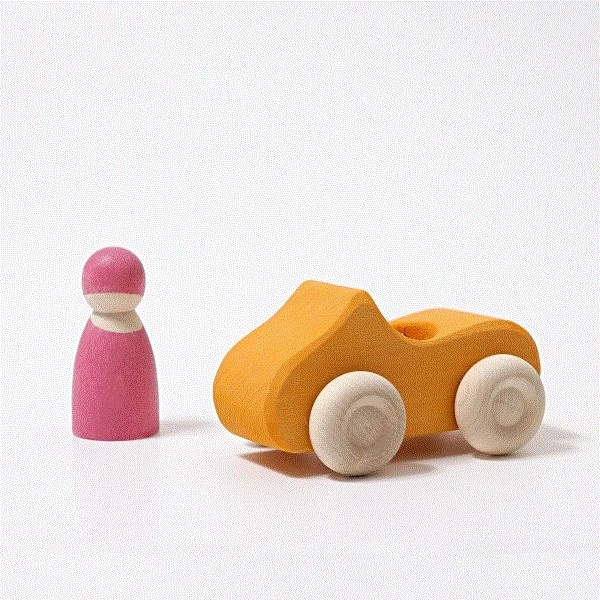 Bitte einsteigen für eine kleine Spritztour im Cabrio. In den gelben Flitzer ist Platz für eine kleine Holzfigur und schon kann es losgehen. Ob drin oder draußen, das Auto ist ein super Spielgefährte. Und wenn die Straßen doch etwas dreckiger waren als gedacht, kann man das Cabrio einfach mit einem feuchten Lappen reinigen.